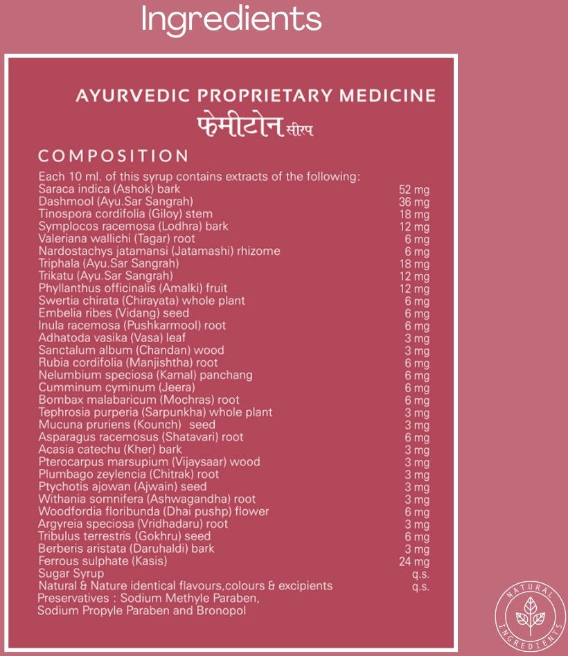| Composition | Ashoka, Lodhra, Liquorice, Trifla, Terminalia, Chebula, etc. |
