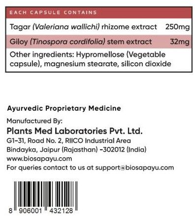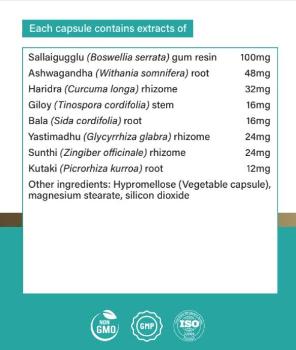 | Active Ingredients | Boswellia,Glycyrrhiza Glabra,Centella Asiatica,Curcuma Longa,Picrorhiza Kurroa,Withania Somenifera,Tinospora Cordifolia,Sida Cordifolia,Zingiber Officinale |