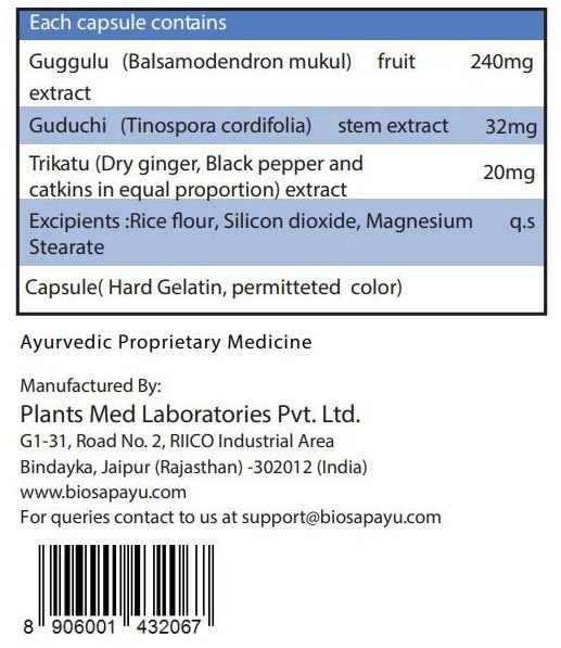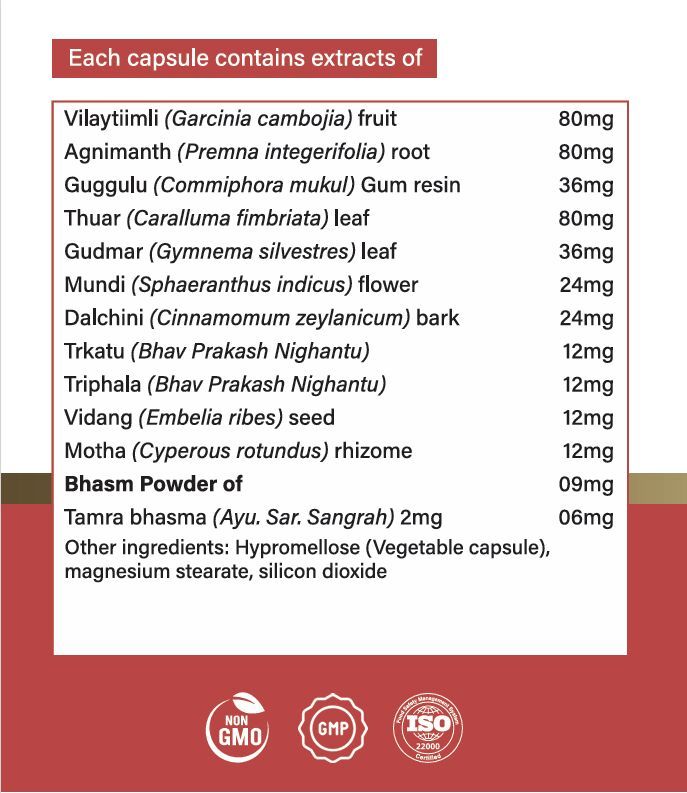 | Key Ingredients | Caralluma Fimbriata,Garcinia Cambogia,Guggulu,Agnimanth,Tamra Bhasma |