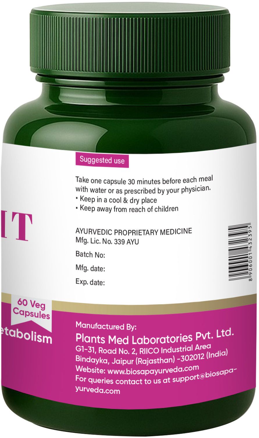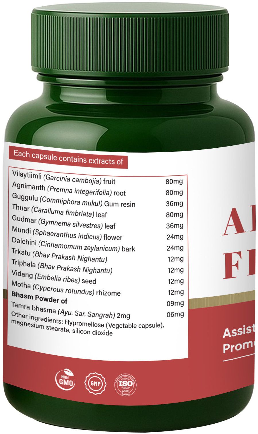 Botanical satiety and digestive tonics support portion control and comfort; lipid-focused herbs aid fat handling. Tamra Bhasma, classically processed, serves as a mineral cofactor in a balanced matrix. Used with protein-forward meals, walking, and sleep, it supports gradual, sustainable change.