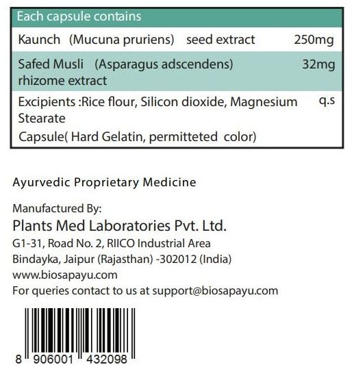 | Key Ingredients | Kaunch (Mucuna Pruriens) Extract,Safed Musli (Asparagus Adscendens) |