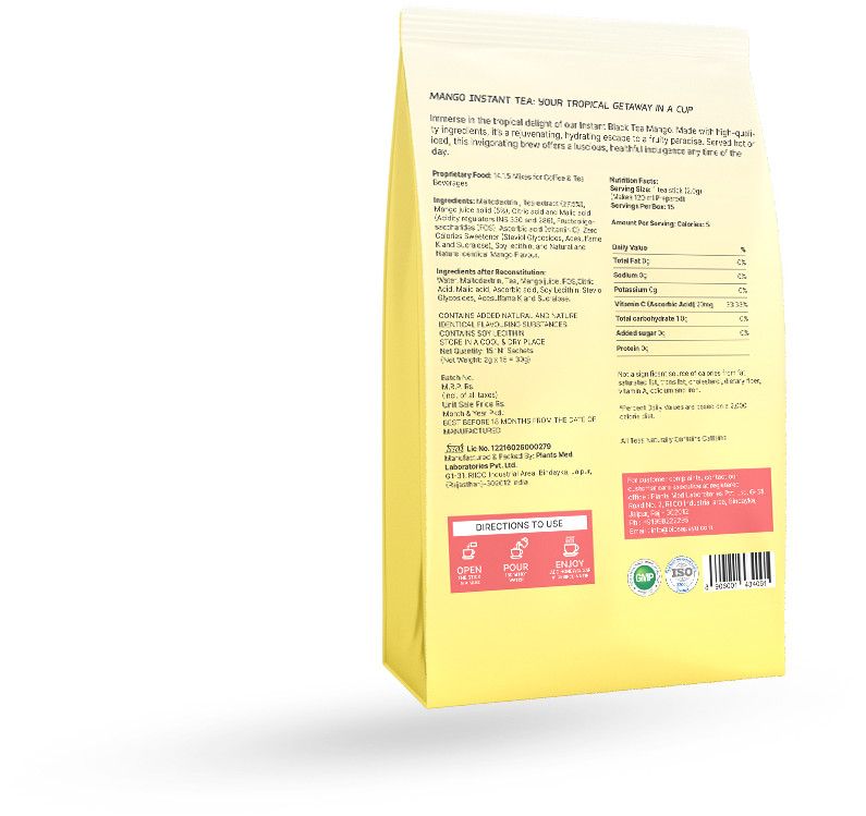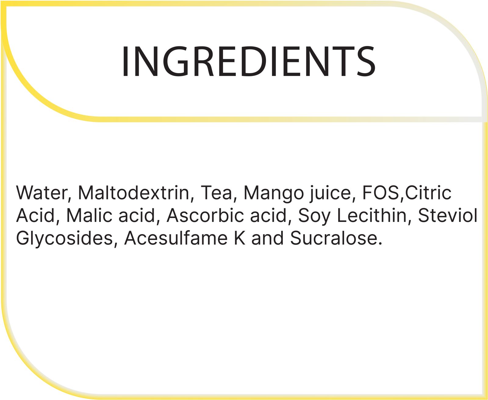 | Ingredients | Black Tea, Mango Juice Solids, FOS, Vitamin C, Maltodextrin, Soy Lecithin,Instant Black Tea |