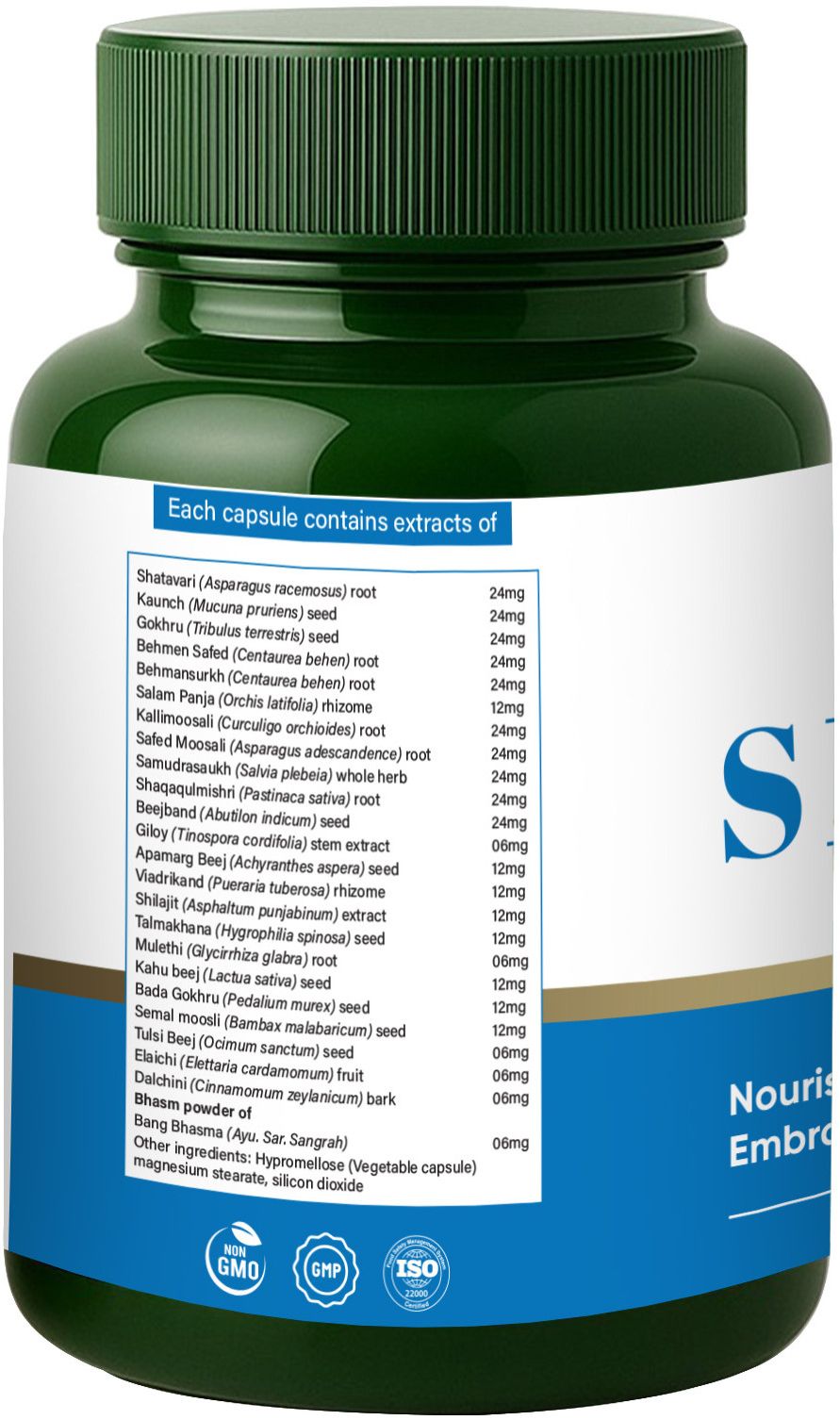 Rasayana botanicals and Shilajit nourish vital tissues and cellular energy; dopaminergic support aids desire & drive; polyphenols buffer oxidative load; carminatives help uptake. Consistent use with diet, hydration, and sleep supports preconception aims.